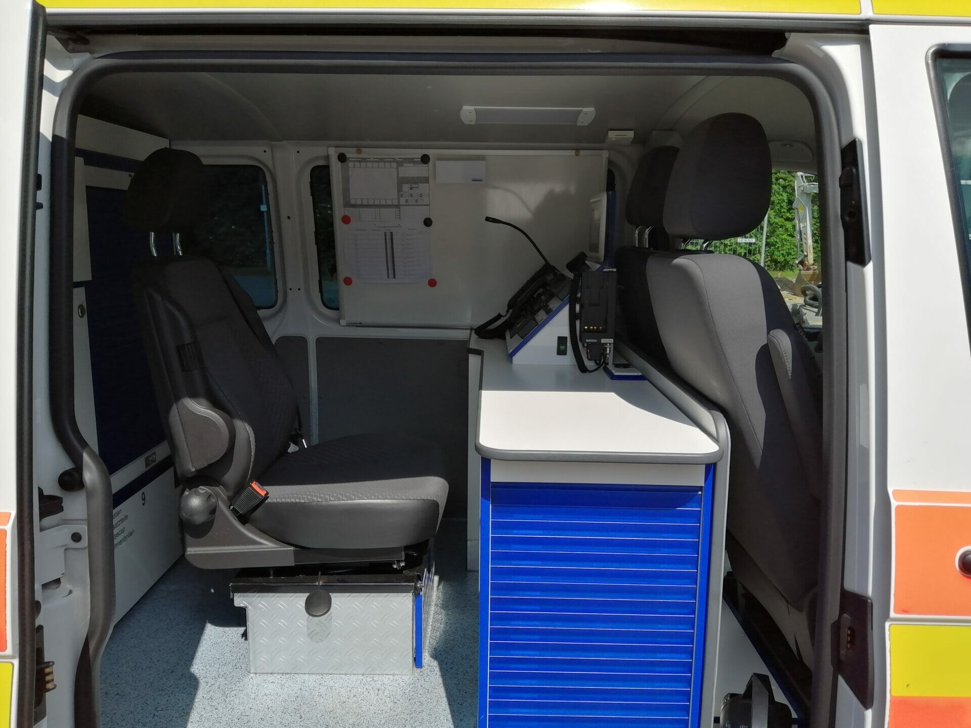 Dieser spezielle Gerätewagen, ursprünglich als Notarzteinsatzfahrzeug im Dienst des Kreises Coesfeld, hat seinen Platz in der Information und Kommunikationseinheit gefunden. Mit Sorgfalt ausgestattet, beherbergt er die modernen Hilfsmittel für spezialisierte Drohneneinsätze. An Bord befinden sich zwei hochmoderne Drohnen, eine davon ausgestattet mit einer Wärmebildkamera. Ein Laptop für Datenverarbeitung und -analyse, ein kompakter 230V Stromerzeuger und ein Leitungsroller sorgen für Energie und Verbindungsfähigkeit. Zudem werden zwei Handfunkgeräte und zwei mobile Funkgeräte für die zuverlässige Kommunikation bereitgehalten. Abschließend vervollständigt das bereitgestellte Dokumentationsmaterial das vielseitige Equipment dieses besonderen Fahrzeugs.