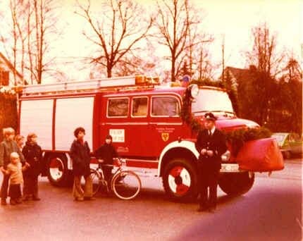 Das LF 16-TS-1 bei seiner Einweihung, geschmückt mit einem Kranz. Wehrführer Spohn bei der Begrüßung der Gäste und der Vorstellung des Fahrzeuges.